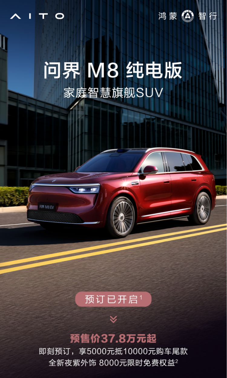 7月25日,“家庭智慧旗舰SUV”问界M8纯电版正式开启预订,预售价37.8万元起,将于今年8月上市。即刻下订,可享5000元抵10000元购车尾款及全新夜紫外饰8000元限时免费权益。