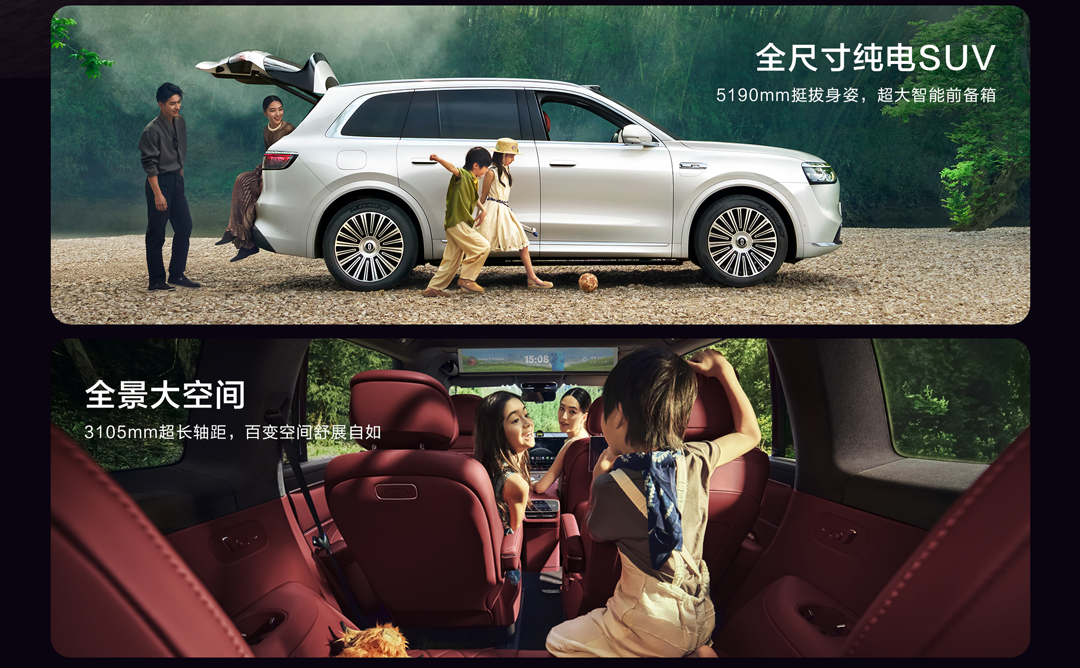问界M8纯电版车身尺寸为5190/1999/1795mm,轴距为3105mm,全尺寸车身带来全景大空间,百变空间舒展自如。同时,问界M8纯电版还新增了支持电动开合的超大智能前备箱,出行更便利。