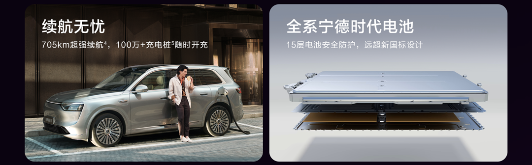 续航方面,问界M8纯电版全系标配宁德时代大容量电池,CLTC综合续航里程最高705km,一杯咖啡的时间,满电出发。