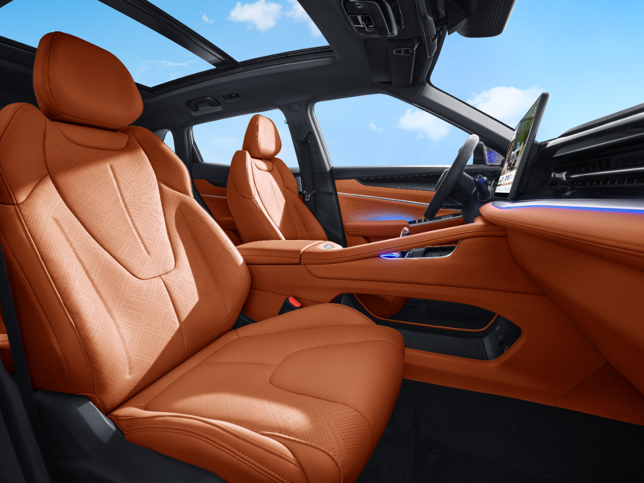 细节方面,3D镭雕·水晶挡把对水晶进行50个面的精准切割,晶莹剔透;光影墨镜·遮阳板,采用符合人体工程学的自上而下透光率渐变设计,既保障前方道路清晰通透,又有效降低顶部强光直射干扰;光韵流转·木纹装饰板质感细腻,配合如意橙和福禄灰的双色内饰主题,营造出优雅舒适的驾乘氛围,让每一次出行都成为享受。