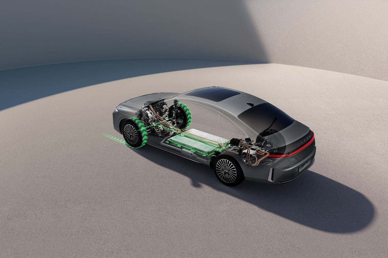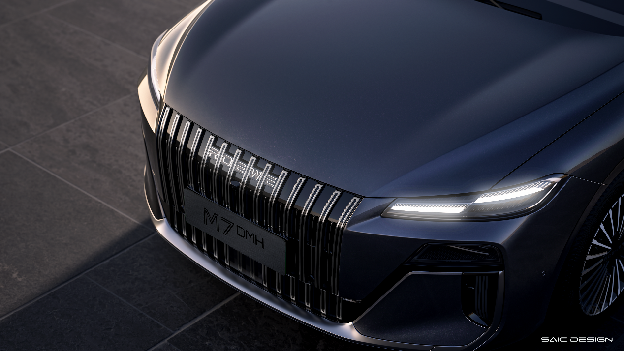 除了超长续航、超低油耗和智慧座舱,荣威M7 DMH在外观设计与空间表现上也充分考量了家庭用户的需求。作为前劳斯莱斯设计师约瑟夫·卡班加盟上汽后打造的首款量产车型,其设计沿袭“明珠”概念车“自信·优雅”的美学理念,大气稳固的车身比例搭配直瀑式威仪前脸,展现出荣威品牌在趋同环境中对原创设计的坚守。矢量光轨晶钻日行灯、3D悬浮贯穿尾灯、“ROEWE”呼吸光语LOGO灯,以及同级唯一荣耀迎宾光毯等细节,进一步提升了整车的高级感与辨识度。
