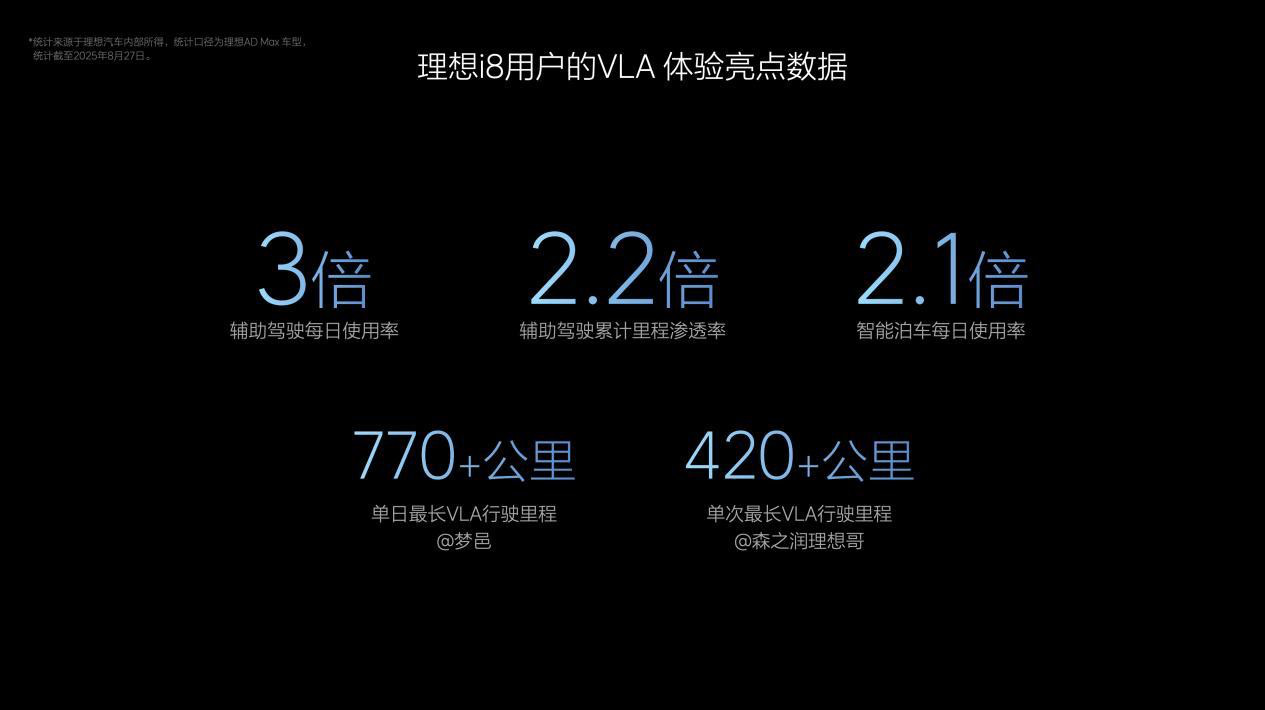 自8月20日理想i8与VLA司机大模型同步交付以来,市场反响热烈。首批理想i8用户中的单日最长VLA行驶里程超770公里,单次最长VLA行驶里程超420公里。VLA随理想i8上市交付后,辅助驾驶每日使用率提升3倍,累计里程渗透率提升2.2倍,泊车每日使用率提升2.1倍,也意味着VLA司机大模型成为了用户真的爱用且好用的辅助驾驶。