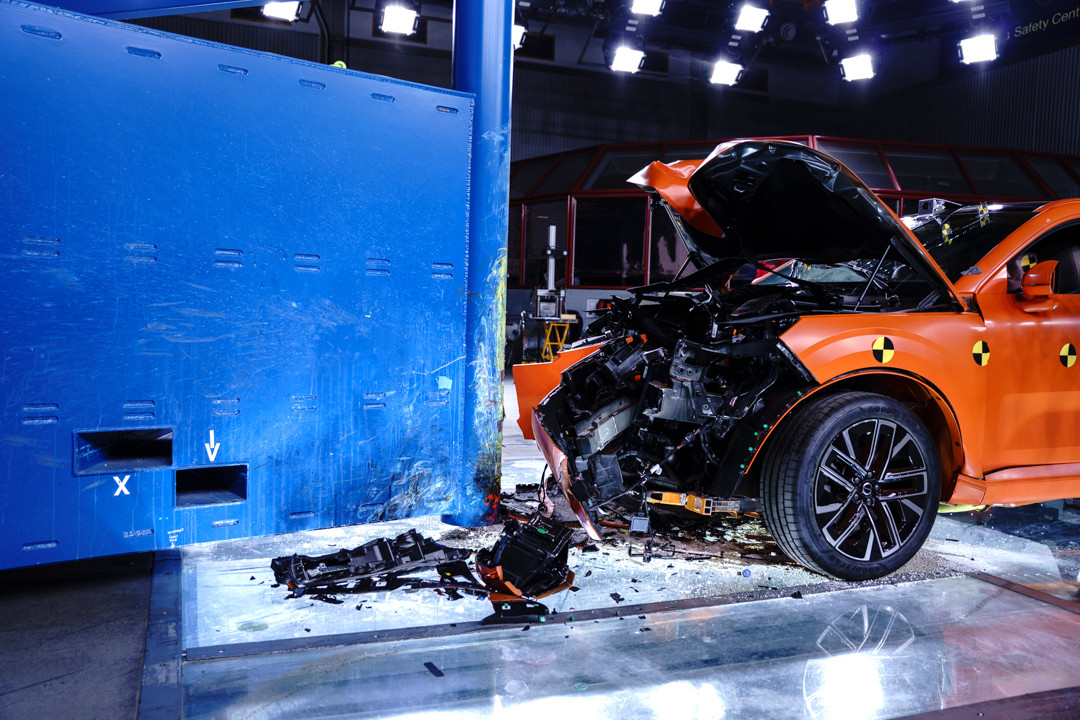 此次的中心柱碰撞测试,在全新XC70车内放置4个碰撞假人,模拟一家四口的出行场景。然后以50km/h的速度进行正面中心柱的碰撞。主要检验的是全新XC70与狭窄物体发生正面碰撞时,对汽车前部受到集中冲击力的安全表现。