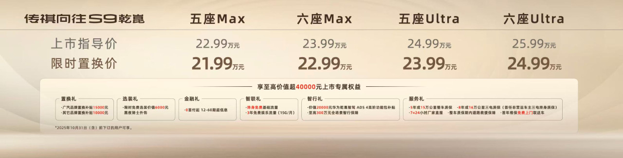 市场指导价22.99万元起(限时置换价21.99万元),还可享至高价值超4万元上市专属权益,包括2万元的华为乾崑智驾ADS4高阶功能包及至高300万元全场景智行保障等。