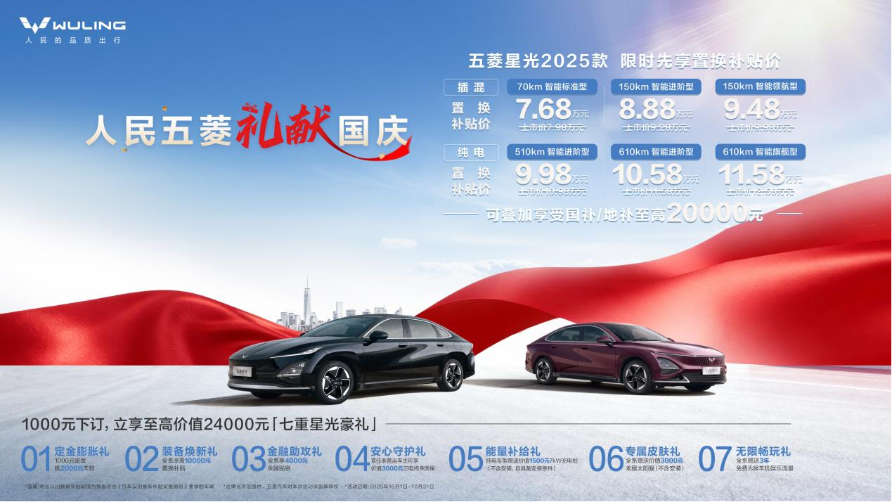为回馈用户的信赖与支持,五菱推出「人民五菱,礼献国庆」购车福利:10月下订五菱星光,置换补贴价7.68万元起,可享至高价值24000元「七重豪礼」,包括1000元定金抵2000元车款、全系至高10000元置换补贴、全系享4000元金融贴息等。
