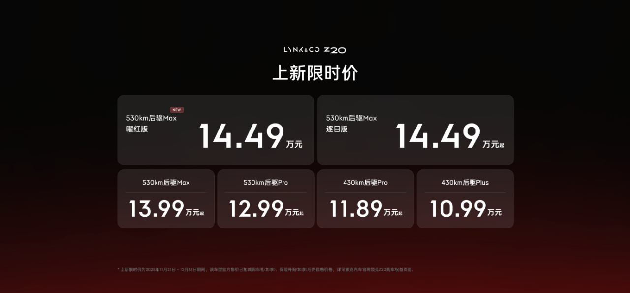 2025年11月21日,“智趣驾享纯电SUV”领克Z20 530km后驱Max曜红版(简称领克Z20曜红版)在广州车展上新发布,上新限时价14.49万元。即日起,用户可登录领克官方APP订购新车,享受包括购车礼、金融礼、焕新礼在内的多重购车权益,2025年11月21日至2025年12月31日期间锁单并提车的前200名用户,还可获赠价值666元的“LYNK & CO Z20 × 非必要不合作Nidea·Nlight 联名电气灯”。
