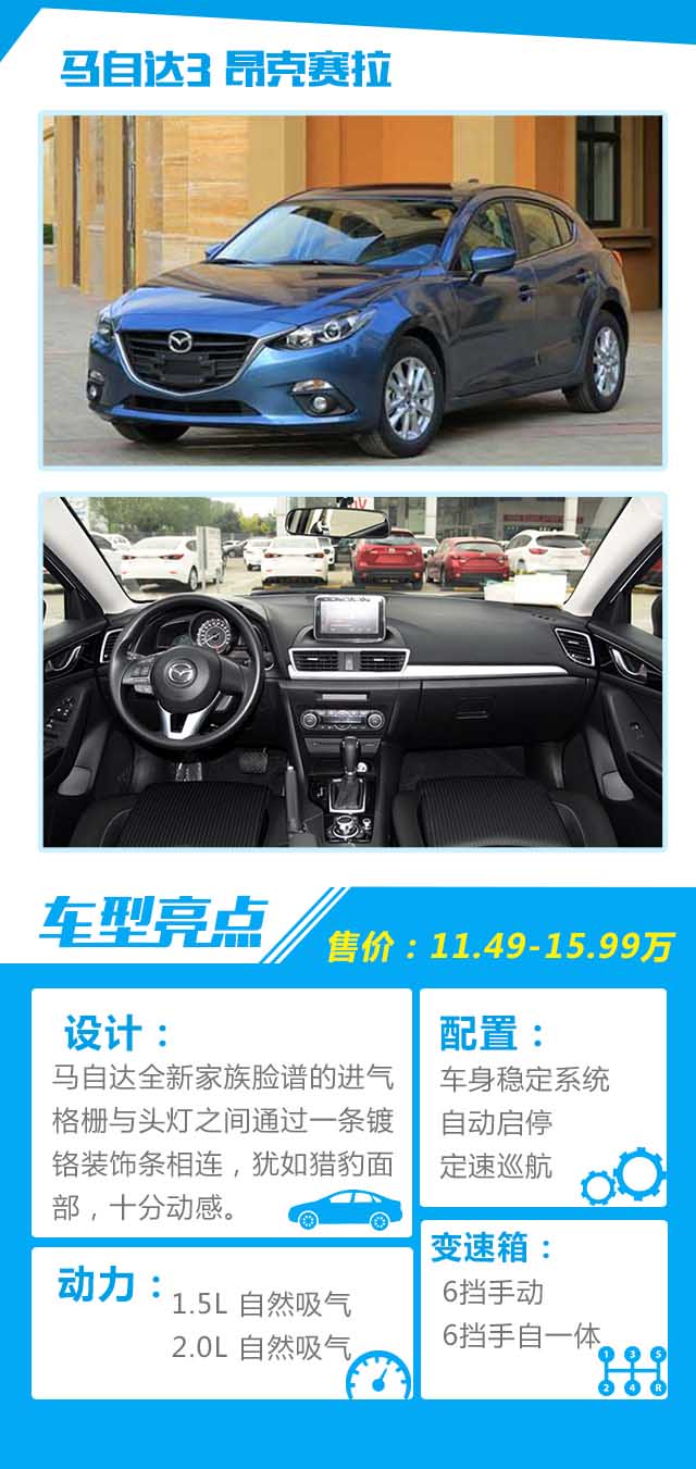 总结:马自达3 昂克赛拉的外观、内饰以及动力系统一整套创新设计都给人耳目一新的感觉。昂克赛拉搭载的是采用了拥有创驰蓝天技术的1.5L和2.0L自然吸气发动机,其中1.5L自然吸气发动机最大功率117马力,最大扭矩148牛米,2.0L车型最大功率158马力,最大扭矩202牛米,匹配的是6挡手动和6挡手自一体变速箱。1.5L车型平均油耗约为7.3L/100km、2.0L车型平均油耗约为7.8L/100km。