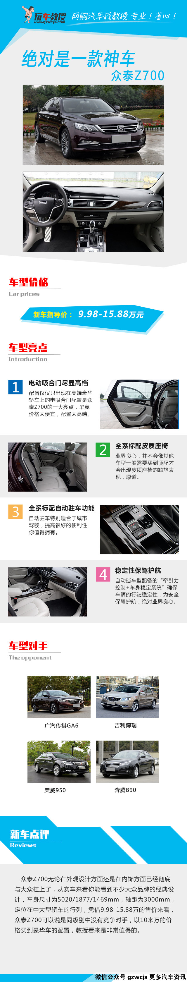 自从15年12月28日众泰Z700上市以来,教授的手机、微信、评论区已经被淹没了,很多朋友都来咨询教授说众泰Z700怎么样,买什么配置性价比高等等的问题。教授特意去了解了一下它的配置,最后只得出两个:惊艳。外观造型设计大气搭配上如此逆天的配置,而且价格又不高,太逆天了。