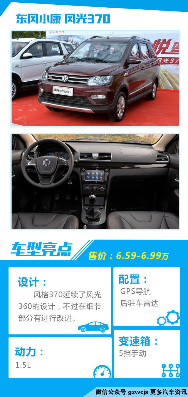 点评:风光370由风光360延伸而来,并且加强改进,从风光360的表现来看,风光370绝对不会差到哪去。风光370的优势主要在车内空间,车厢内座椅可灵活调节,在载人拉货方面也更加多变。