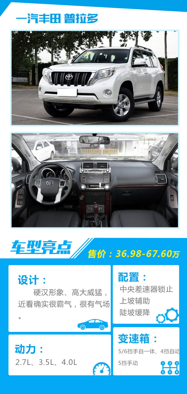 点评:说起普拉多可能会显得陌生了一些,我们还是叫它霸道吧,从进口再到后来的国产,霸道总是能给人惊喜,它也是国内越野车极具代表的一款车型。