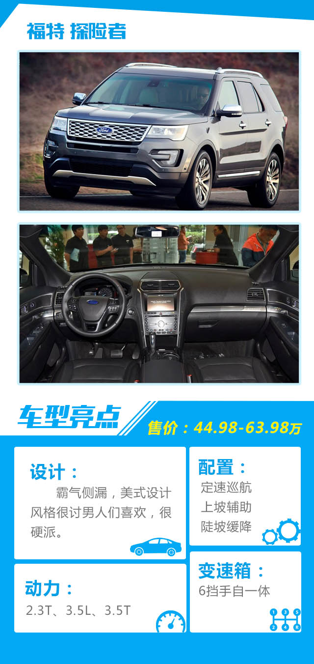 点评:经过改款后,探险者变得更加时尚、霸气,而且新增了2.3T和3.5T两款发动机,在选择性上变得更加多样,在不失舒适性的同时兼具了征服各种路况的能力,值得选择。