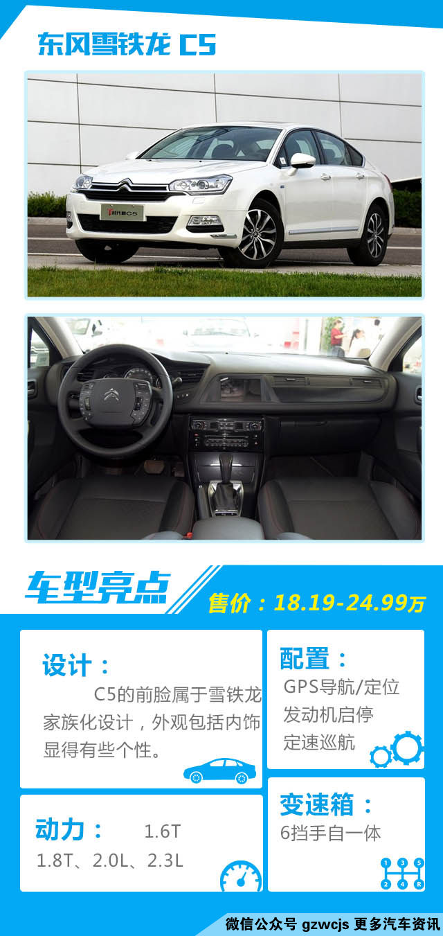点评:C5扁平修车的车身注定高度不是优势,但车身高度并不是决定车内空间的重要因素,其轴距同样达到了2815毫米,在同级别中处于领先水平,属于佼佼者。