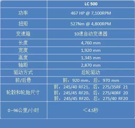 作为LEXUS雷克萨斯后驱家族最新产品,LC 500配备了全新的动力单元,包括5.0升V8发动机和全新10速自动变速器。在RC F和GS F上已被充分验证的5.0升V8发动机能够在7100转/分时爆发467马力的最大功率,并在4800转/分时提供527牛•米的峰值扭矩。