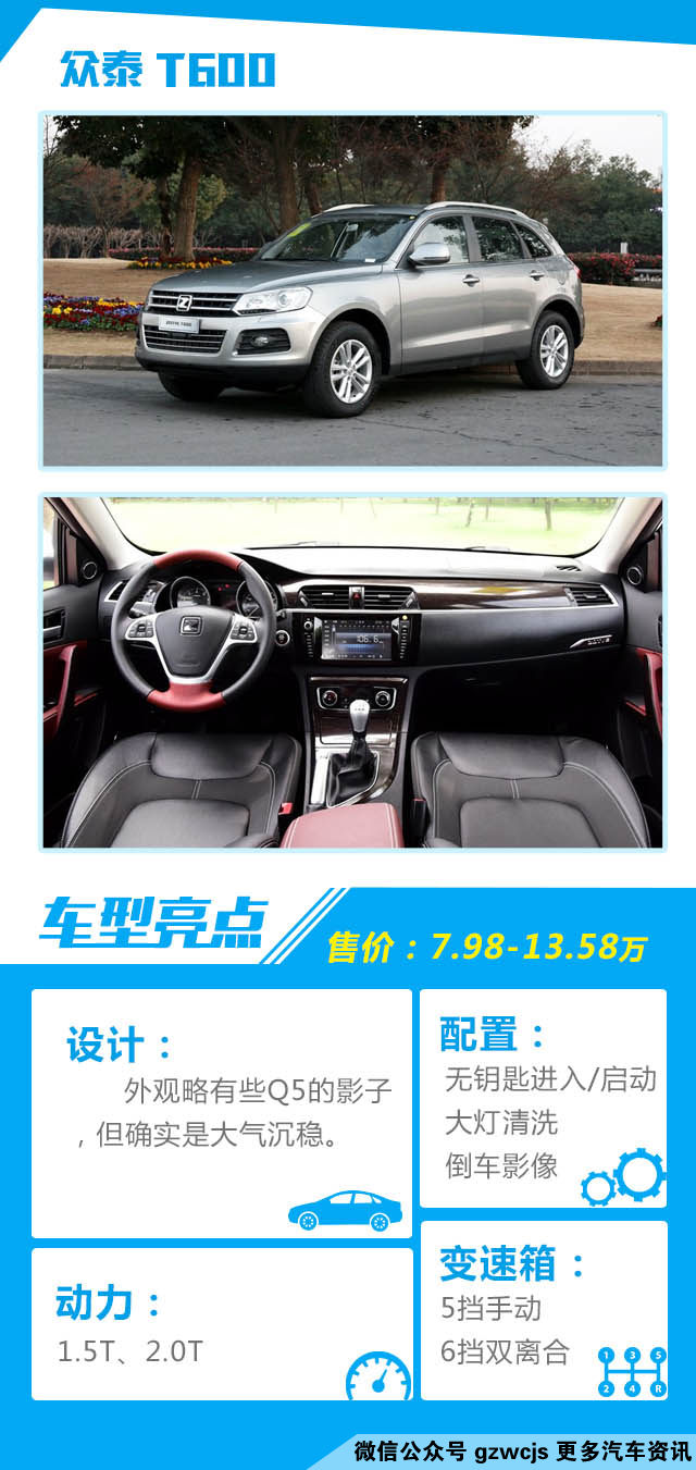 点评:众泰T600是一款争议比较高的车,不过这也令它的关注热度始终很高,销量过万是最高的证明,大气的外观,精致的内饰,众泰这款车还是很值得肯定的。没错,众泰T600同样配备有无钥匙进入/启动功能,与上面骏派D60在停车场时可以有相同场景,而且,T600还有大灯清洗装置、车内氛围灯、自动头灯等配置,以及有争议的外观,当真Bigger than bigger!