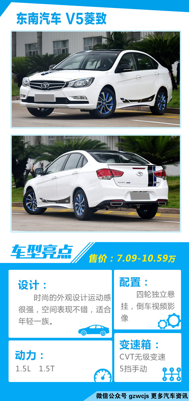 东南汽车V5菱致,时尚的外观设计成功吸引了一大批年轻人的注意。内饰的设计也算中规中矩,空间在同级别车型中算是中上水平了。动力能够达到一般的家用水平。整车来说还是比较中肯的。教授推荐它,其实是看在V3菱悦的份上,那一台它那个价位内开过都说好的车,而V5菱致可以说是升级版的V3菱悦。
