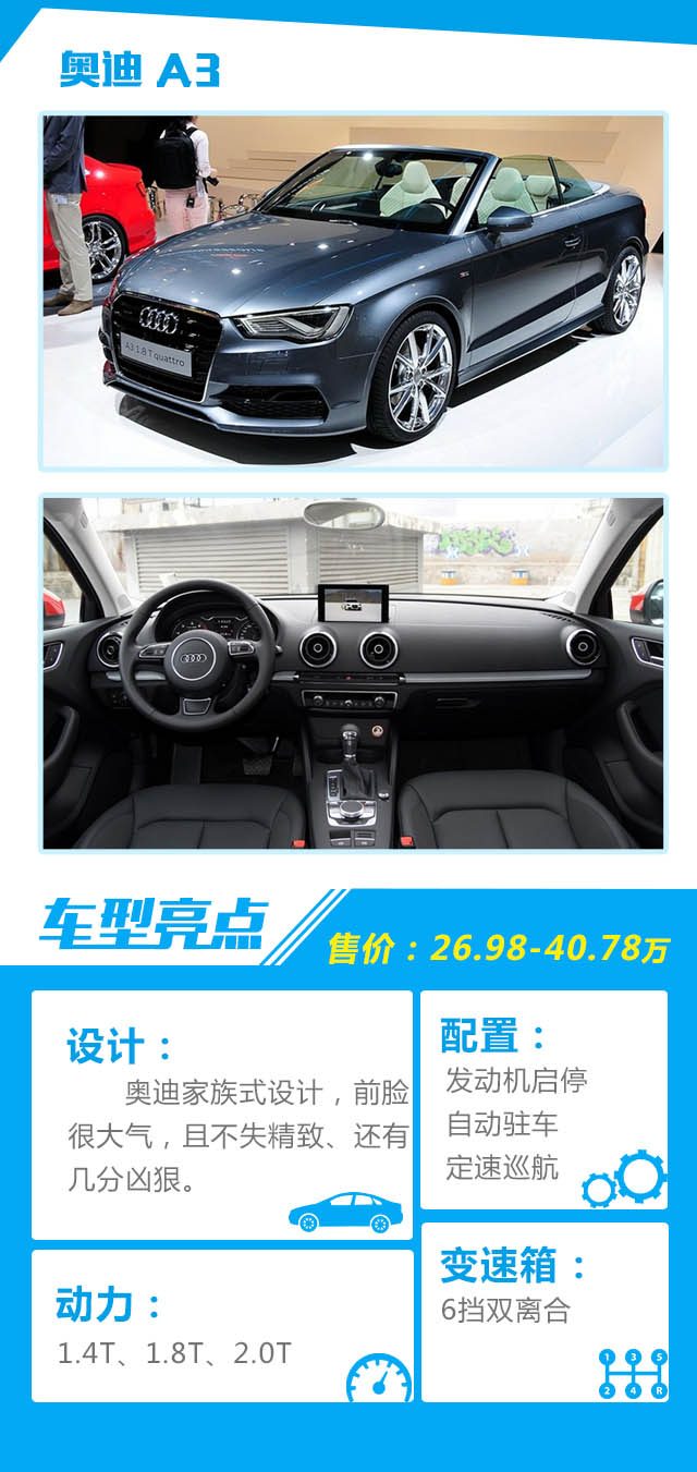 点评:这款奥迪A3 Cabriolet 40TFSI 同样是进口车型,与其它进口版A3其实没太大不同,只不过是敞篷版,更加拉风,更吸睛,就为了这个,你得为它多花费几万,毕竟买这款车重点就是要它的张扬,与众不同。