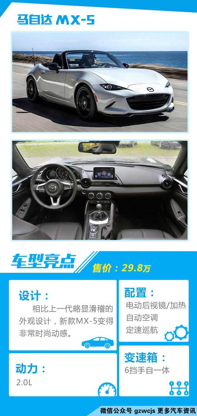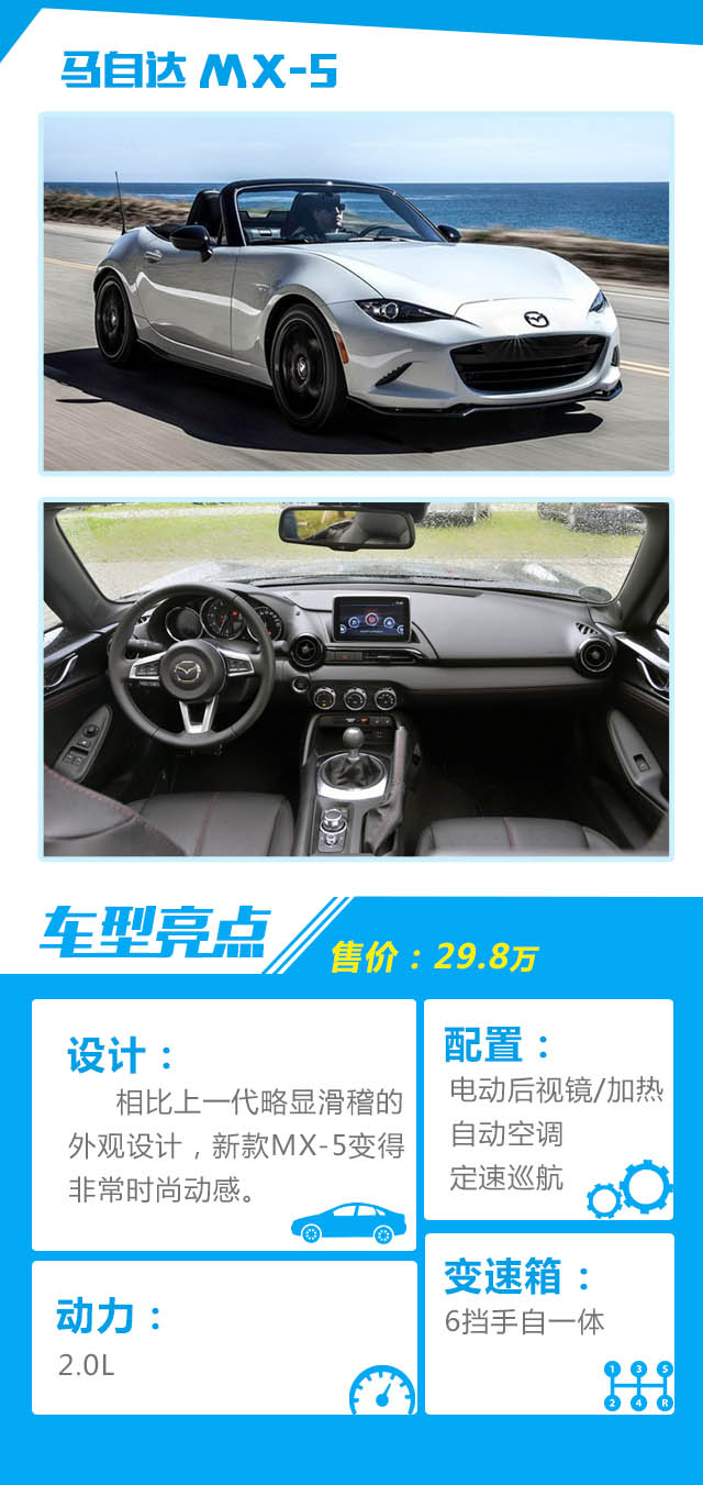 点评:当教授想到给大家写一篇拉风,回头率的导购时,除了以上两款车之外,让我念念不忘的就是这台MX-5,这是一辆集操控、性价比、个性等等好的词于一身的车型,去年被美国知名车媒MT认为是可与奔驰AMG GT做比较的车型。虽然国内目前为09款车型,新款还没进入国内市场,但有消息称将在今年进入中国,以现今在美售2万多美金来看,相信到时价格不会令我们失望。