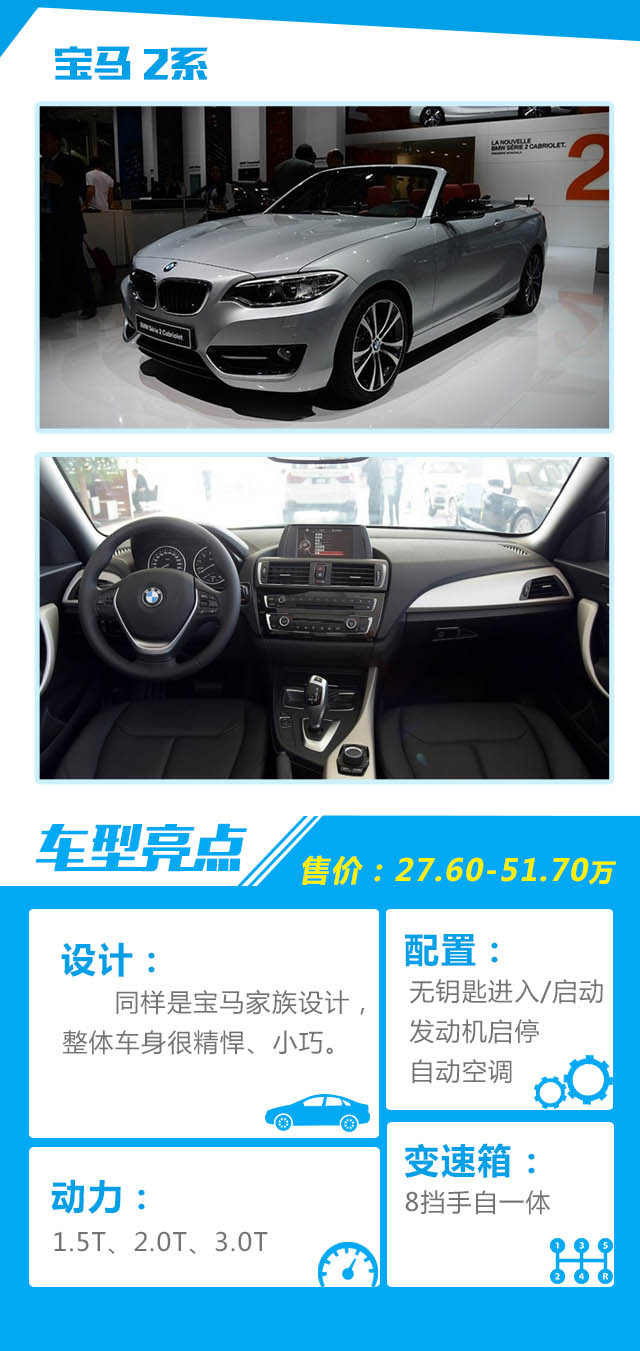 点评:宝马2系分别有3种不同排量车型,分别是1.5T、2.0T及3.0T,教授比较推荐2.0T,是性价比最为突出的,价格合适的同时,其184马力带动这精悍的车身,动力绝对能让你满意,百公里加速仅为7秒。且宝马2系为进口车型,并非与华晨合资生产的车型,喜欢原汁原味的朋友有福了。