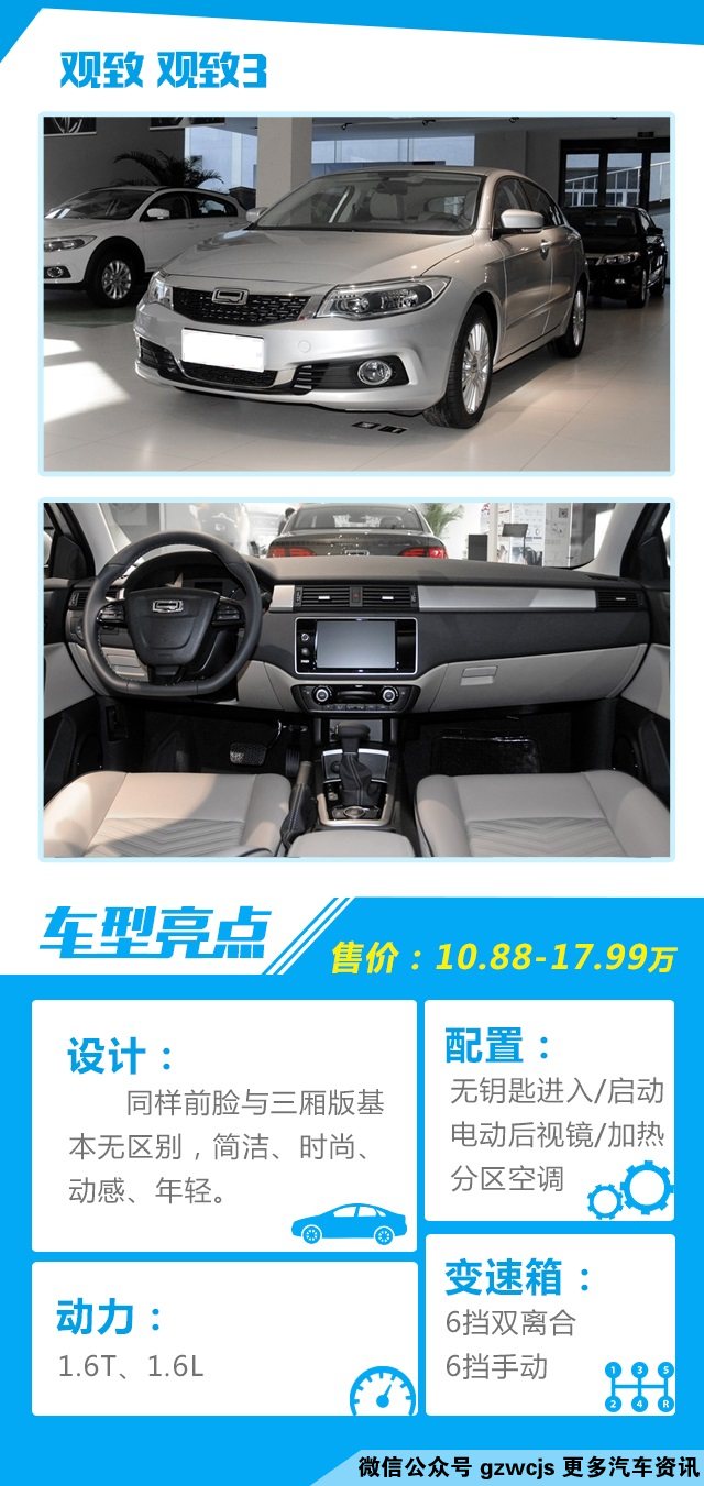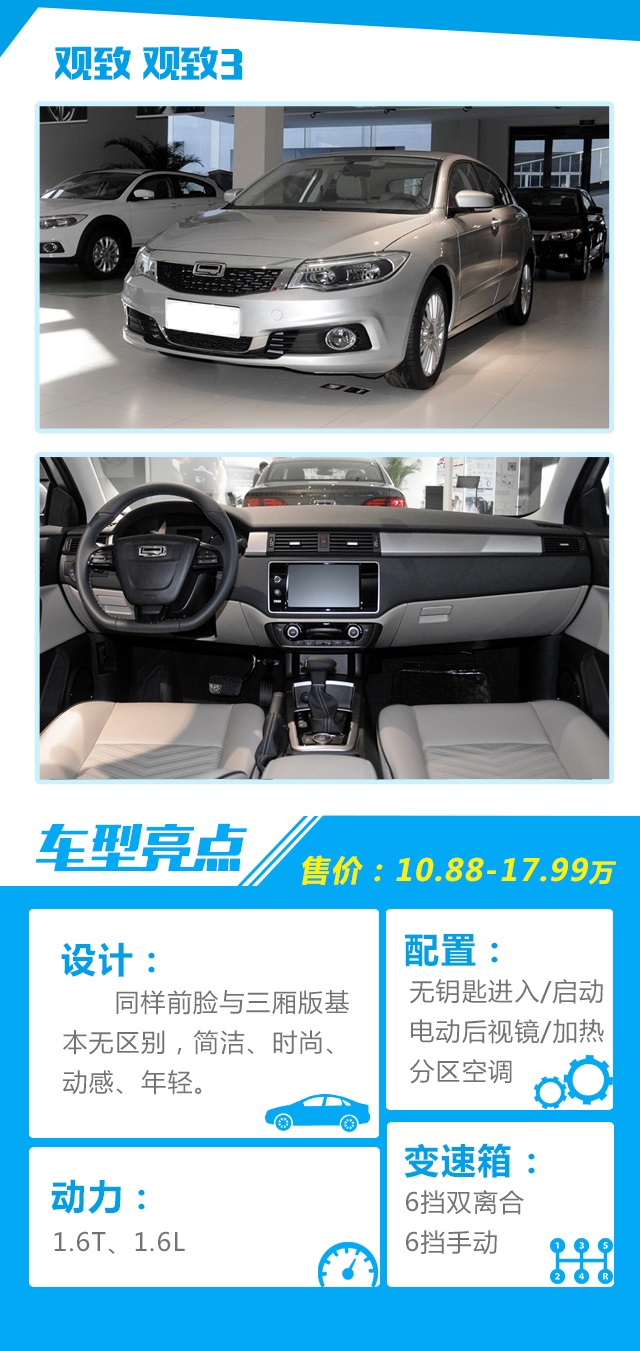 点评:观致3外观不仅有自己独特的设计,很精致,内饰也很值得称赞,而且在安全性,底盘调校等方面也有不错的实力,可惜投入与市场的反馈远达不到正比,不过依然看好观致,毕竟酒香不怕巷子深。