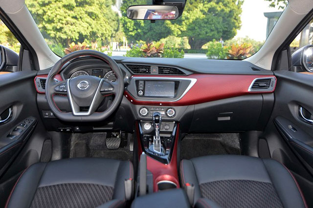内饰设计上,蓝鸟配备了一款平底多功能方向盘,中控台略向驾驶侧倾斜,中控配备大尺寸液晶显示屏,底部中央换挡杆附近为黑色钢琴漆材质,带有红线点缀的黑色座椅也烘托出其内部的运动氛围。
