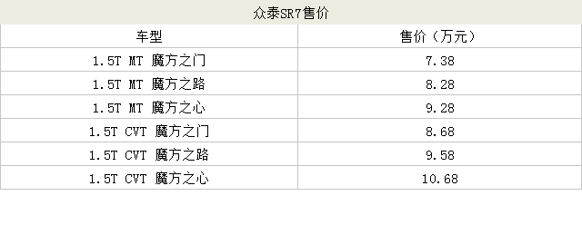在一个月前,教授曾给大家带来了众泰SR7的预售价格,当时关于这款SUV的预售价为7.68-10.98万元,而今天,也就是1月28号,这款算有争议的车型正式上市,一共有6款车型,售价为7.38-10.68万元。