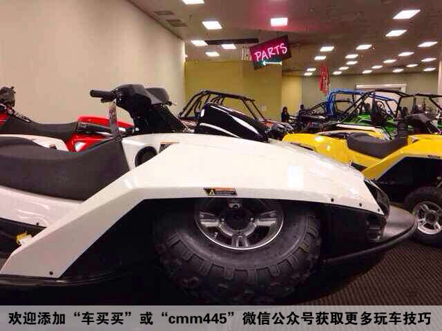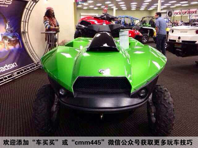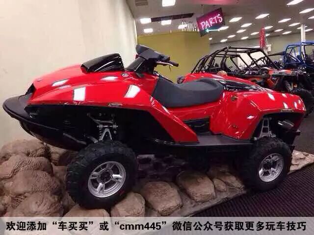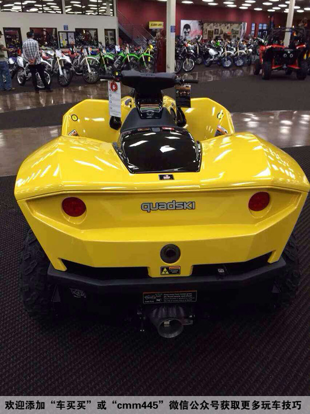 Quadski可收起轮胎、进入水中,路上行驶时又将伸出轮胎。这款产品使用了宝马Motorrad引擎,最高可达175马力最高时速则达到72公里/小时,驾驶员只需轻触按钮,可在5秒内完成水陆行驶模式切换,而其1300磅(约590公斤)的笨重体重也配备15加仑(约等于55升)的油箱。Quadski有黑色、银色、蓝色、黄色和红色五款可选。该车售价高达40000美元,约合人民币25万元(国内需加税费),目前可以在国内购买得到。