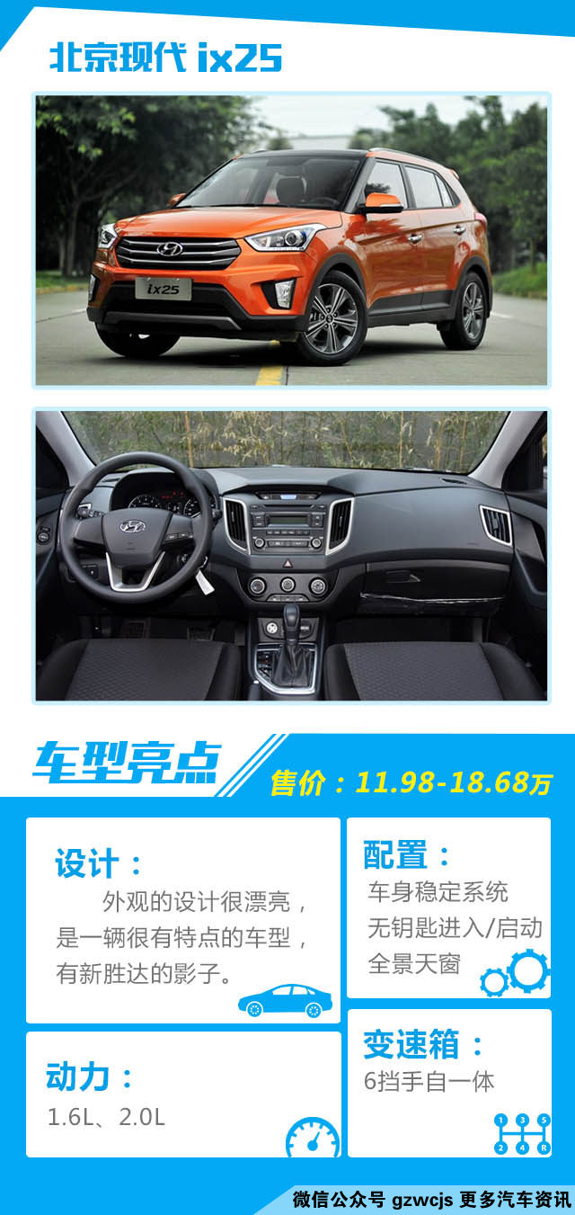 点评:ix25应该是这三辆里最有硬派感觉的了,其它两辆略有些圆润,而ix25有了更多的棱棱角角,设计看起来也更有SUV的味道,全景天窗是一个亮点,整车是一个很舒适的风格,全系标配有ESP系统。
