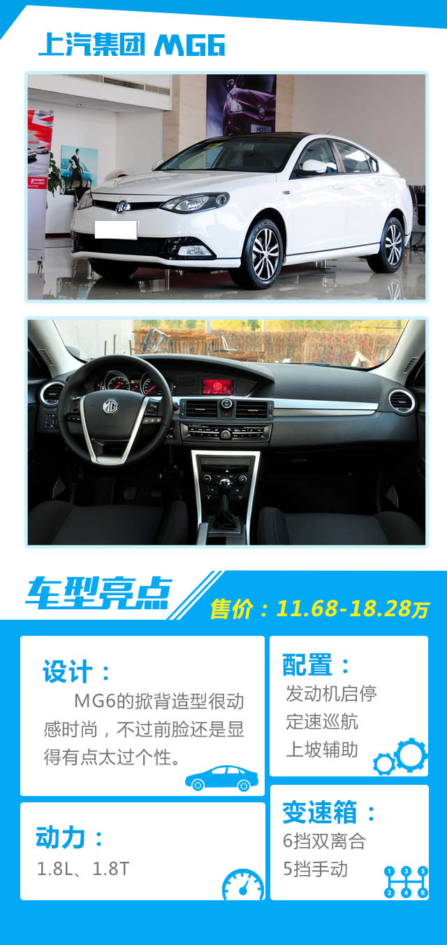 点评:MG6与上面两款中级车不同,这是一辆紧凑级车,不过也是掀背造型,外观小巧精致,在自主品牌里比较少有的,也是比较优美的,不过虽说定位于紧凑级别,但空间却不小,轴距达到了2705mm,这比部分中级车还要长,综合实力还是很不错的。