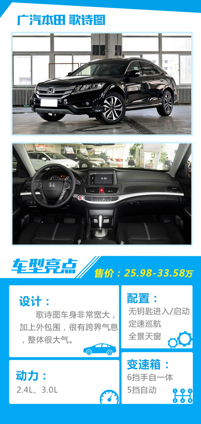 点评:富有个性的歌诗图是一辆内外兼修的车型,外观掀背造型很拉风,很大气,内在我们主要讲它的动力和配置,中期改款过后的歌诗图配置更加齐全,四驱系统及全景天窗的加入更有了竞争力,而除了2.4L的排量外,3.0L也让人在选择上更丰富。