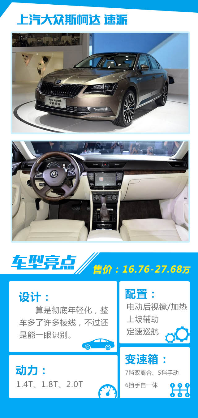 点评:老款速派在我看来就已有不错的竞争力,严谨的做工、合适的价格以及颇高的品质都是速派的亮点,而新速派在老款的基础上进行了升级,更加年轻,更加人性化,更加完美,而后备厢的掀背造型也是一大亮点,开口比一般的中级车要大上不少,在装载的时候会方便许多。