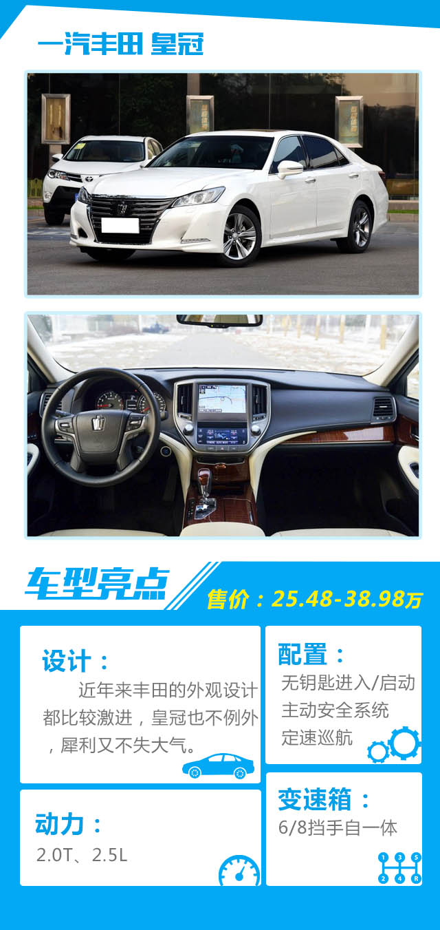 点评:皇冠曾经的辉煌已不再,现在只有一份情怀留于消费者心中,虽不及以往那般出色,但目前第十四代皇冠也还是有许多亮点的,比如油耗,作为一辆中大型车,油耗比大部分中型车还要省,2.0T版本工信部给的数据为百公里7.4L,实际油耗也差别不大,很出色。