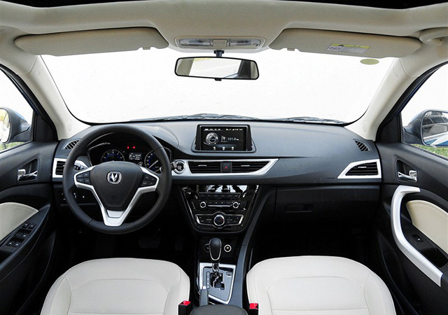 内饰方面,独立的中控液晶显示屏幕相当显眼,整体风格偏运动;遗憾的是长安的造工差的毛病,也如约地出现的V7身上,虽然硬质塑料经过了细腻的纹理修饰,但还是给人一种廉价的感觉。