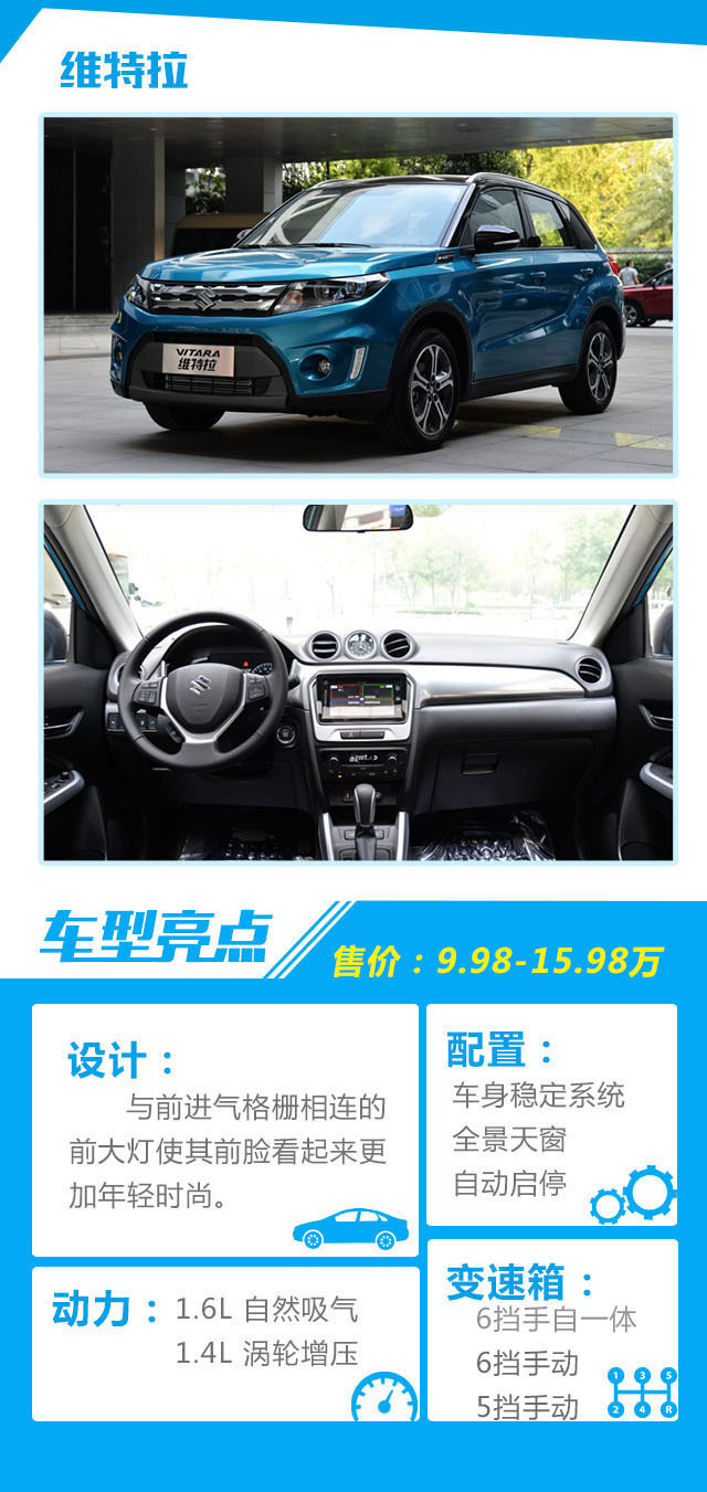 点评:维特拉的外观时尚个性,丰富的安全配置,充足的动力,还有着出色的驾乘感受使得其主要消费群体还是以年轻人居多。但是需要说几句的是维特拉在细节做工和舒适性配置上的表现并不好,这两点希望厂家能够及时做出改变。