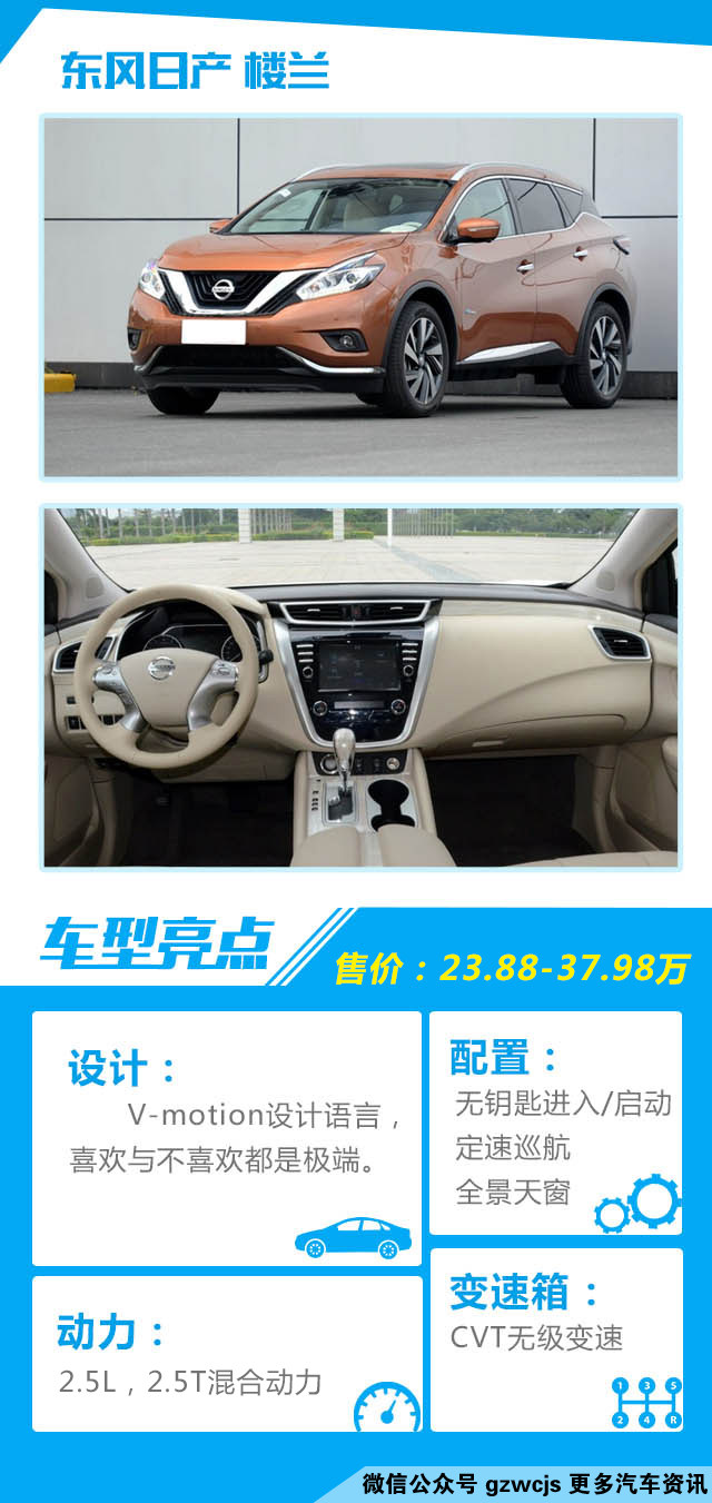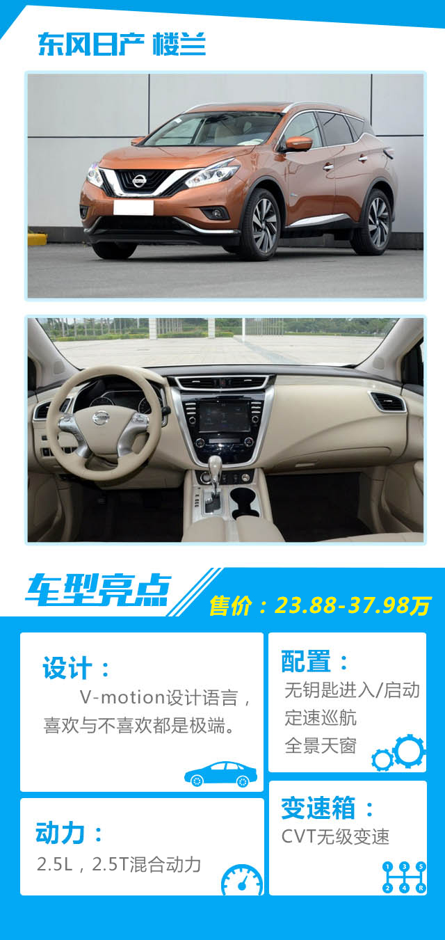 教授点评:还记得上一代的楼兰吗?除了贵,恐怕大家已经想不起什么印象了。而这一代的楼兰则不一样,教授曾在路上看过多次,且不说是好看还是不好看,但起码是吸引了我。视觉重心除了集中在车头的V-motion语言之外,悬浮式车顶也是特点之一。不过可惜的是,新楼兰的内饰依然是让人提不起劲,有点内外不统一的感觉。价格基本落在合资中型SUV的范围,但没有7座有点可惜。