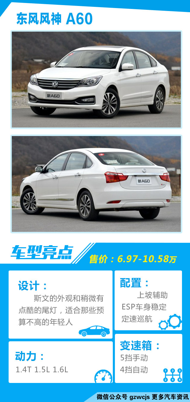 点评:东风风神A60小编在一次打车经历中坐过,后排的乘坐空间和舒适性真的不错。油耗也很好,大概5毛一公里。外观很斯文,看起来不会激进和毫无亮点,算中规中矩。配置也很实用,动力在家用方面也能够满足要求,总体来说值得去关注一下。