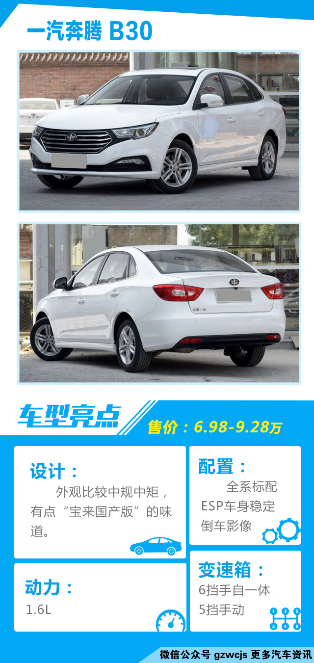 点评:奔腾B30刚刚推出不久,外观的设计明显倾向于年轻消费者。配置方面很不错而且能够全系配备ESP系统说明一汽对安全的要求很高。不过1.6L的发动机却没能像预期一样输出很好的动力,但是家用已经足够了。油耗方面表现还算不错。除了动力,这车还是非常不错的。