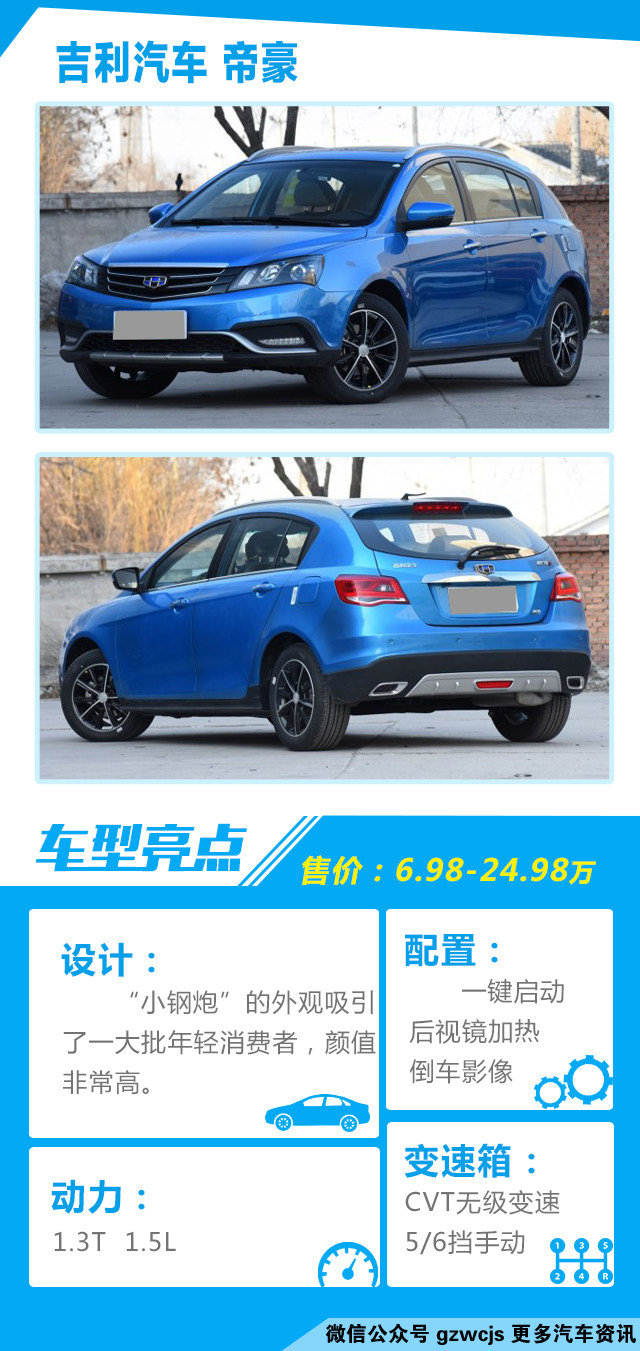 点评:外观方面很有“小钢炮”的味道,设计师的用心可以看出来。内饰做工在同价位中算是不错的,操控还算精准,没有什么太大的虚位。两厢版的帝豪空间不是很够但是动力很足,油耗表现一般。“外貌协会”的可以关注一下这车。
