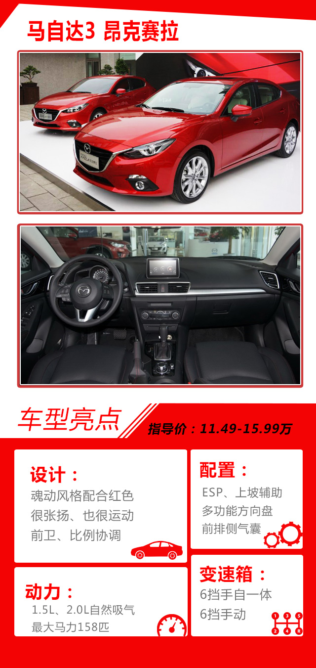 操控犀利,比较有驾驶乐趣。而且油耗控制出色,2.0L车型动力充沛、加速线性。再加上时尚、动感的外观,是年轻、活力的好选择。