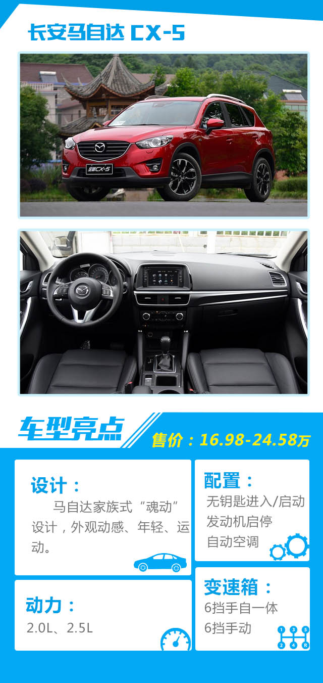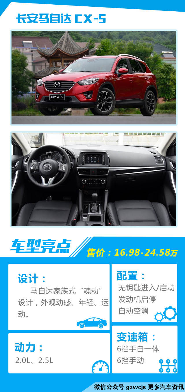 点评:CX-5我个人认为是一辆颜值很高、动力很足等各方面很均匀的车型,但自上市以来却表现平平,也许这与其跟阿特兹同样的内饰老土不无关系,抛开这点不谈,CX-5用于城市中行驶绝对不赖,油耗低、动力足、颜值高。
