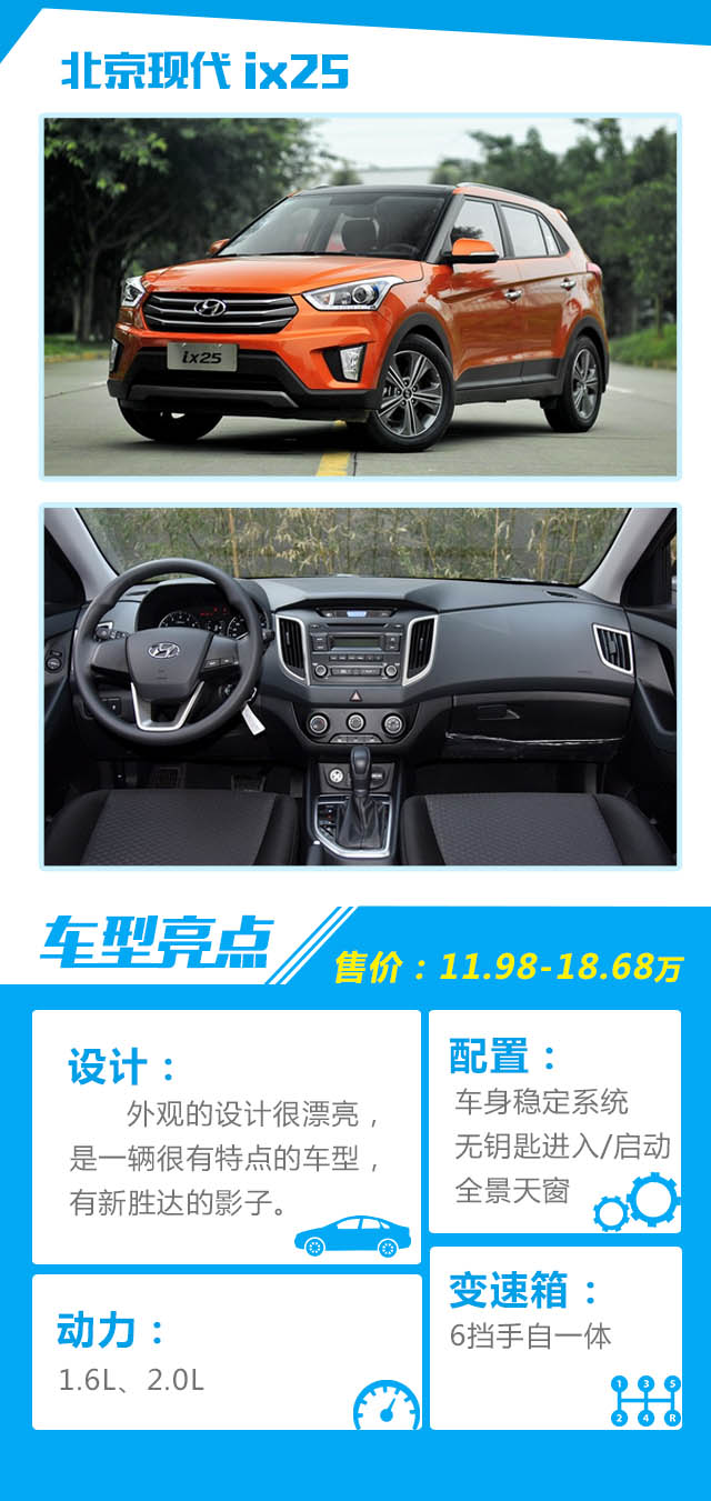 点评:ix25是这三辆车里颜值最高的车型,隐藏的A柱很耐看,搭配上硬朗的车身线条让ix25很讨人喜欢,而且其继承了韩系车配置颇高的传统,全景天窗及全系标配ESP系统是一个亮点。