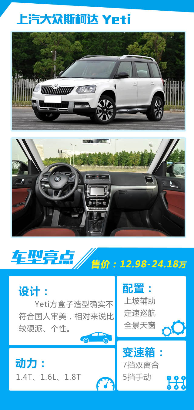 点评:Yeti这一车型在国内确实不受待见,硬派复古的外观造型难以俘获消费者的心,或者可以说是呆板。但实际上其与大众途观来自同一生产平台,只因为赋予了它一个不待见的外观,结果销量也就天差地别,但Yeti是一部很不错的车型。