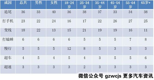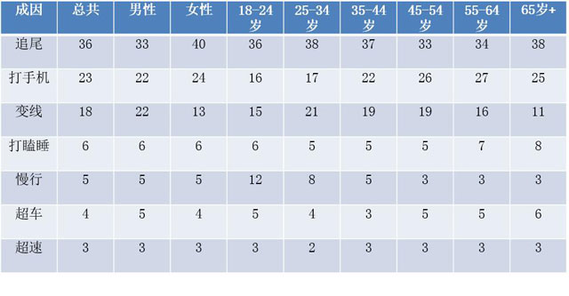 你会发现,造成车祸的原因,无论是哪个年龄段、性别,超速都是十分靠后,只有2-3%左右。发生事故成因当中,跟车太贴追尾、打手机是车祸的只要成因。虽然这只是一个外国的统计,但是我们不妨以此来对照我们国内,来看看自己是不是拥有以上的一些开车恶习。
