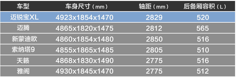 如下表所示,整个B级车里,其它的车型都无法与迈锐宝XL进行对比,唯独只有蒙迪欧在数字上超过了迈锐宝XL,这不但体现在车身长度和轴距上,也同样体现在发动机功率上。