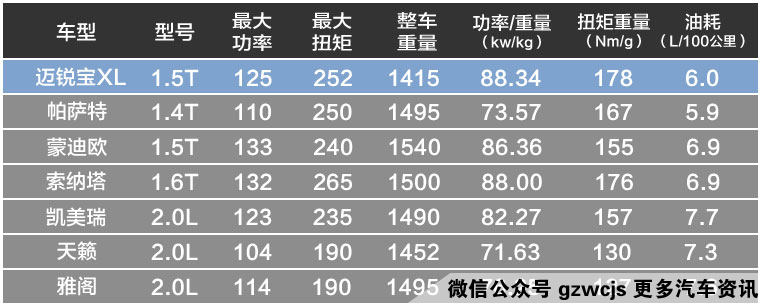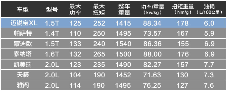 再来看看迈锐宝XL的主力车型1.5T。与同级对手相比,似乎数据上并无大幅领先,但在北美试驾时同车的都觉得动力不错,一点也不肉,这是为什么呢?这里必须提到功率重量比和扭矩重量比。我们在看发动机效率的时候,不能仅看功率和扭矩绝对值,而要把重量也放进去,发动机应该根据其车身重量来合理匹配,由此提升燃油经济性。先进发动机搭配方案,其功率/重量比值和扭矩/重量比值会很高,而我们看到在这方面(下表有展示),迈锐宝XL的数值在B级车里,是最高的。