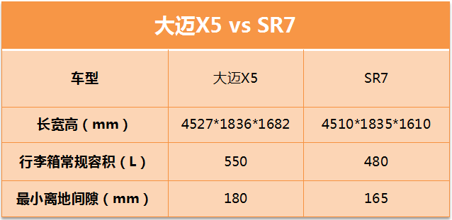 车辆参数上看,大迈X5的尺寸和SR7相差无几,小编为大家整理出了以上几点区别在尺寸上,大迈X5长宽高都要略大于SR7,并且在视觉上大迈X5的设计也要更加显大,并且大迈X5有着更高的离地间隙,行李箱常规容积也比SR7多出70L的空间,如果你是比较注重实用性的人那么显然大迈X5更加适合你。