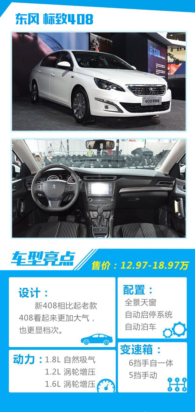 点评:新款标致408的外观比老款要好看太多,而且在配置上也有很大的进步,动力家用足够,同时又有着不错的燃油经济性;虽然后排头部空间有些压抑,但是为了它这个好看的外观,损失一点后排乘客的头部空间也是非常值得的。