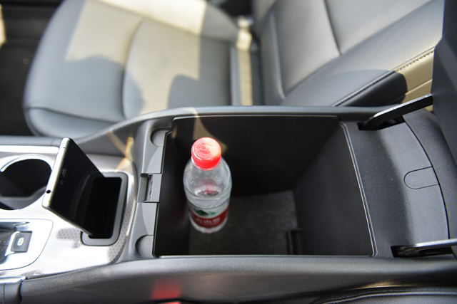 扶手箱足可以容纳四瓶XX山泉,而且还能完美盖上扶手箱盖