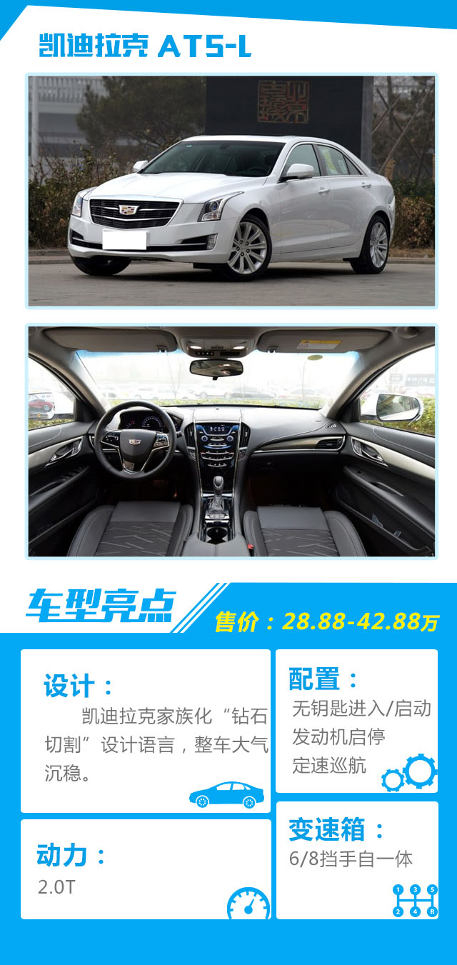 点评:ATS-L也是30万内为数不多采用后驱形式驱动的车型,而且,ATS搭载了一台高功率的2.0T发动机搭配8速手自一体变速箱,其操控及稳定性很大方面因素就是建立在这套动力总成+后驱形式上,BBA之外豪华入门车选择需有ATS一席。