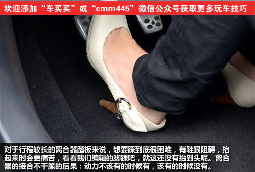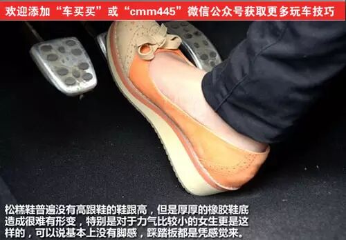 高高的鞋跟让脚无法正常的踩脚踏板,紧急情况下根本踩不到底,这就好比是在鞋底下垫了一块砖头。即使将脚踏板踩到底,估计你的脚已经是有种快抽筋的感觉,而且用力的时候也很容易崴脚。由于脚的弯曲度有限,所以抬起踏板的时候,脚后跟会出现悬空,在此情况下就不能很好的控制踏板的角度了,油门、刹车、离合器哪个控制不精准都是很要命的。(提醒女性朋友:驾车远离高跟鞋!)