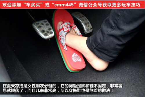 穿凉鞋、拖鞋最大的问题就是鞋与脚固定不牢固,不论是凉鞋还是人字拖开车都很危险。我身边的朋友曾经亲身经历过,踩刹车的时候软质的人字拖鞋底折成了90度,卡在了刹车和 地板之间,脚是踩不下去也抬不起了,听着都后怕。夏天喜欢穿拖鞋开车的同胞要重视。